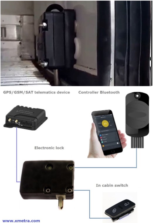 The locking system can be controlled using an existing vehicle telematics system (GPS / GSM tracking) or a smartphone with a mobile app that communicates with a dedicated Bluetooth controller, or by help of a standard switch installed in the cabin. If the main power source (vehicle battery) was drained it is possible to use a compact and cost-effective back-up battery.