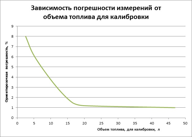 Специально после таких жалоб на то, что долго калибровать NozzleCrocodile мы провели исследование и получили четкую зависимость между количеством топлива, потраченным для калибровки и погрешностью, с которой в дальнейшей эксплуатации будем получать данные о фактическом расходе. На графике четко видно, что приемлемая точность получается после 15-20 литров. Исследование проводили на Suzuki X90, но думаю зависимость применима и к другим моделям. Основная погрешность метода Долива заключена в том, чтобы как можно точнее воспроизвести на заправке уровень полного бака. Ну и колонка даёт свою погрешность. Что же касается других методов, то мне представляется, что вырабатывание топлива из мерной ёмкости (наподобие процедуры контрольного пролива для расходомеров) на таких автомобилях, где применим NozzleCrocodile, еще более затратна и вряд ли будет намного точнее.