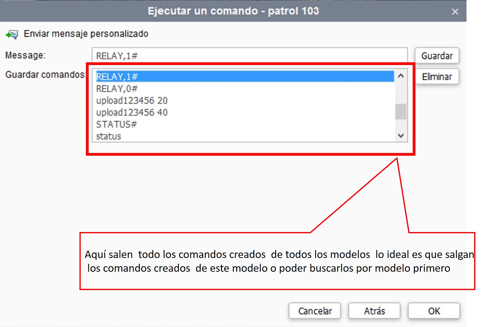 vamos ha ver le explico yo me voy a la ficha del gps y creo un comando llamado comandos varios por ejemplo por tcp y creo los comandos en la lista de comanc¡dos de la parte baja hata este momento bien este gps es de una marca y tiene su propia lista de comandosuna vez hecho esto nos vamos al panel de seguimiento y pulsamos el icono con la flechita de comandos tenemos ese comando que dice comandos varios picamoe en el y seguir se nos despliega el menu con todos los comandos de todas las marcas en ese momento deveriamos de poder elegir los comando por marca o por modelos para que no salgan todos me ha comprendido usted