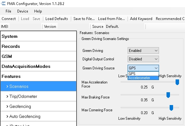 Я хотел бы использовать функцию "Green driving scenario". Как должен быть размещен модуль FM1100 таким образом, чтобы "Max acceleration force" и "Max braking force" находились в правильном направлении к транспортному средству? Должен ли FM1100 быть горизонтально (вверх тормашками), USB в передней и задней антеннах?