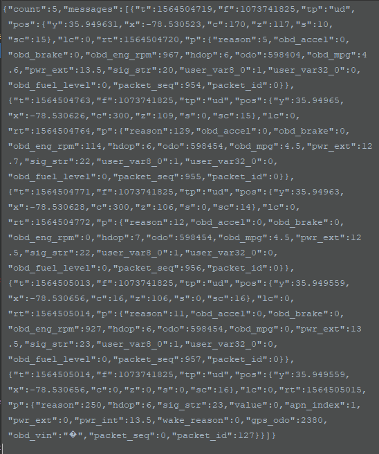 Actually I have more information which lead me to another question. For that last set of params, this is the response I get before I json_decode it (see attached). You can see the question mark on the last line in obd_vin. When I pull that same message inside Wialon, this is what it looks like: (see 2nd attached). Do you know what could cause a question mark to be returned there? I'm pretty sure that's what is causing my issue, but I don't know how to prevent it because I don't know what's causing it.