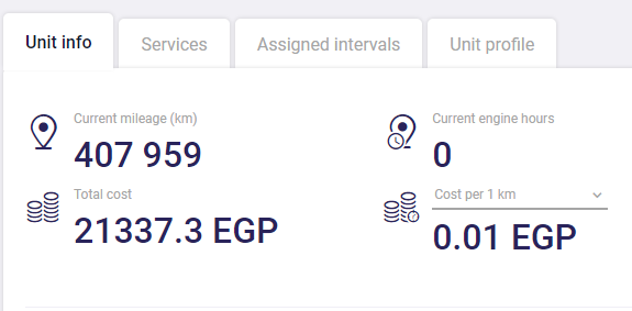 the current cost / km = the cost / (all mileages of the unit since yeaaars ago before even using fleetrun) which is misleading